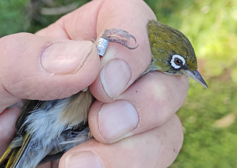 We set up a fine-meshed “mist net” to see if we could catch some birds to band with tiny aluminium rings with even tinier numbers on it – that’s for the kids who wanted to work for DOC and become scientists.