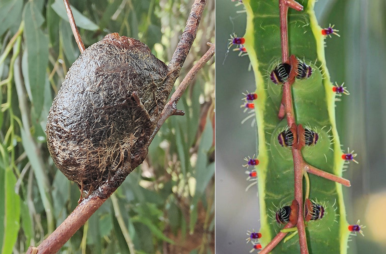 After about three weeks they’ll spin a cocoon, brown and rather hard. Ironically this moth belongs to the silk moth family, but this Aussie silk is of rather inferior quality – not soft enough to make clothes from.