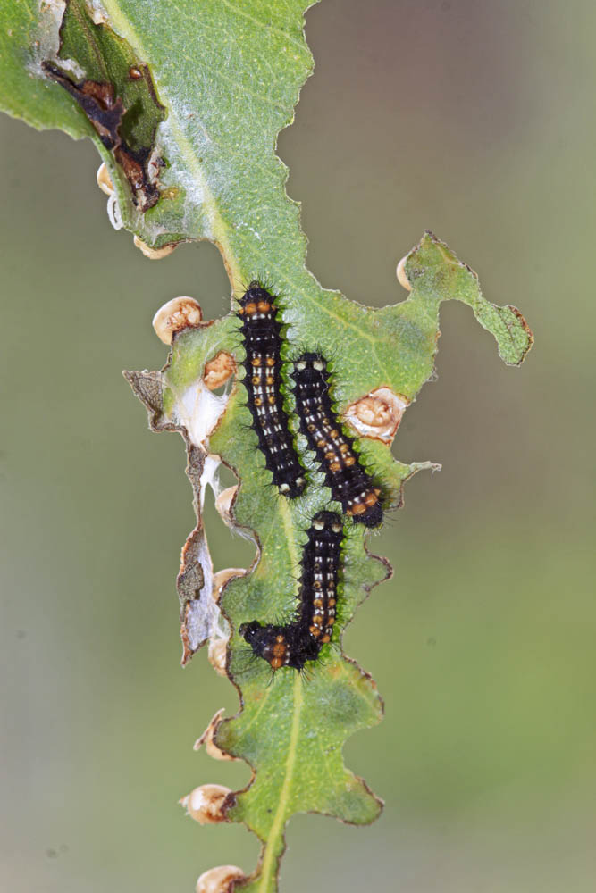 Now’s the time to look for them in the “wild” – in the South Island they occur all the way down to Canterbury (Lincoln and Banks Peninsula is as far south as they get). The smallest caterpillars are quite dark in colour – almost blackish and about 8mm long. As they grow (and shed their skins) they change their colours and cause distinct chewing marks on the lower gum leaves.
