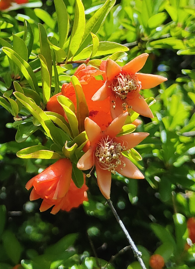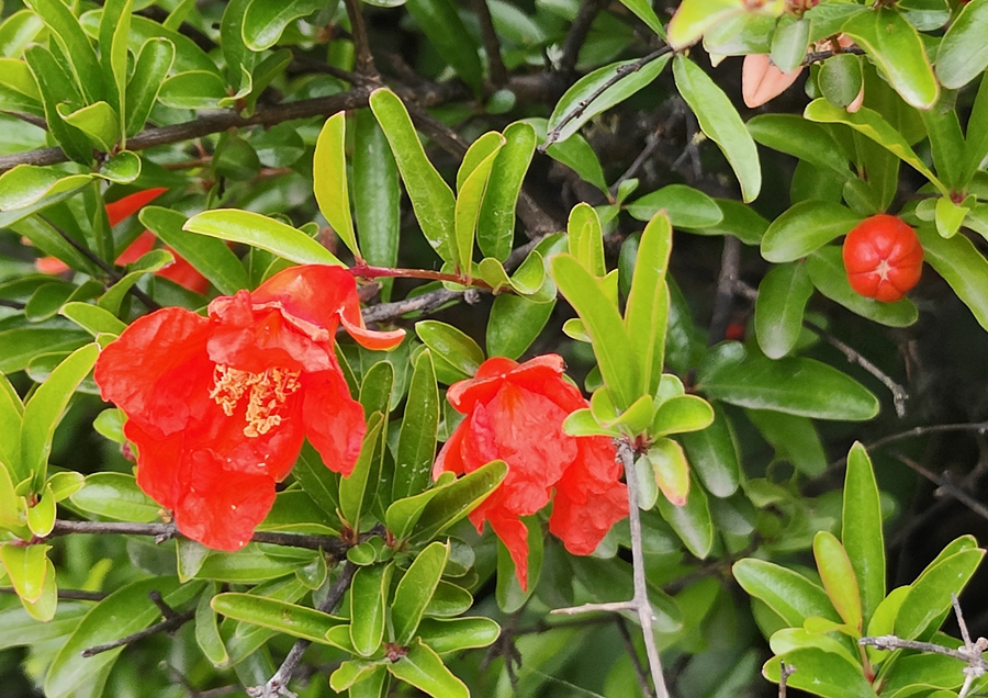 Punica granatum is the one with red flowers that hails from the Mediterrané and Tropical and Sub-Tropical regions.