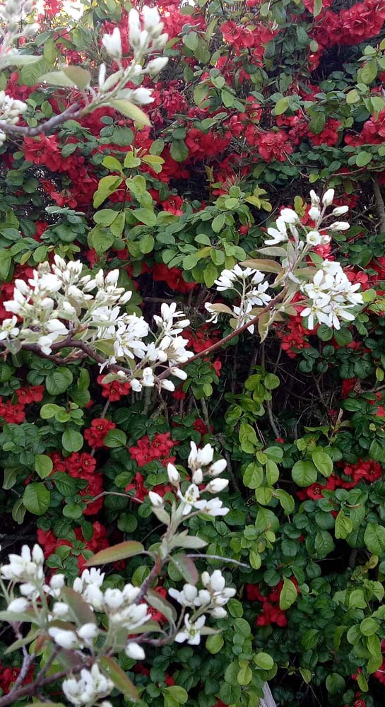 Now we’re seeing Amelanchier blossom contrasting with Chaenomeles flowers. On the other side of the garden our native Clematis is absolutely covering the old, dead trunk of an impressive birch. Clematis needs its “head” (the flowers) in full sun but the roots need to be in total shade, covered with at least 20 cm mulch, to keep it moist and cool.