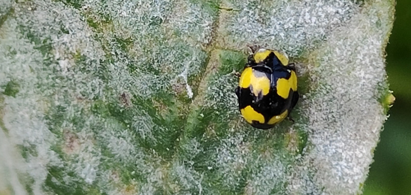 The name says it all: “Powdery Mildew”. The small white patches are a dead give-away, and so is the presence of characteristic black-and-yellow ladybird beetles – they spread the fungal spores around.