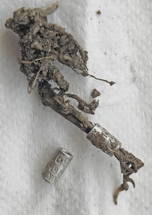 The first one (rather muddy) was banded at my place in the southern end of the quarry in July last year and therefore lived for just 6 Months. The second one (without its bird leg) was initially caught and banded on the northern end of the quarry in July 2021; we caught that bird a few times in its 4.5 years of life.