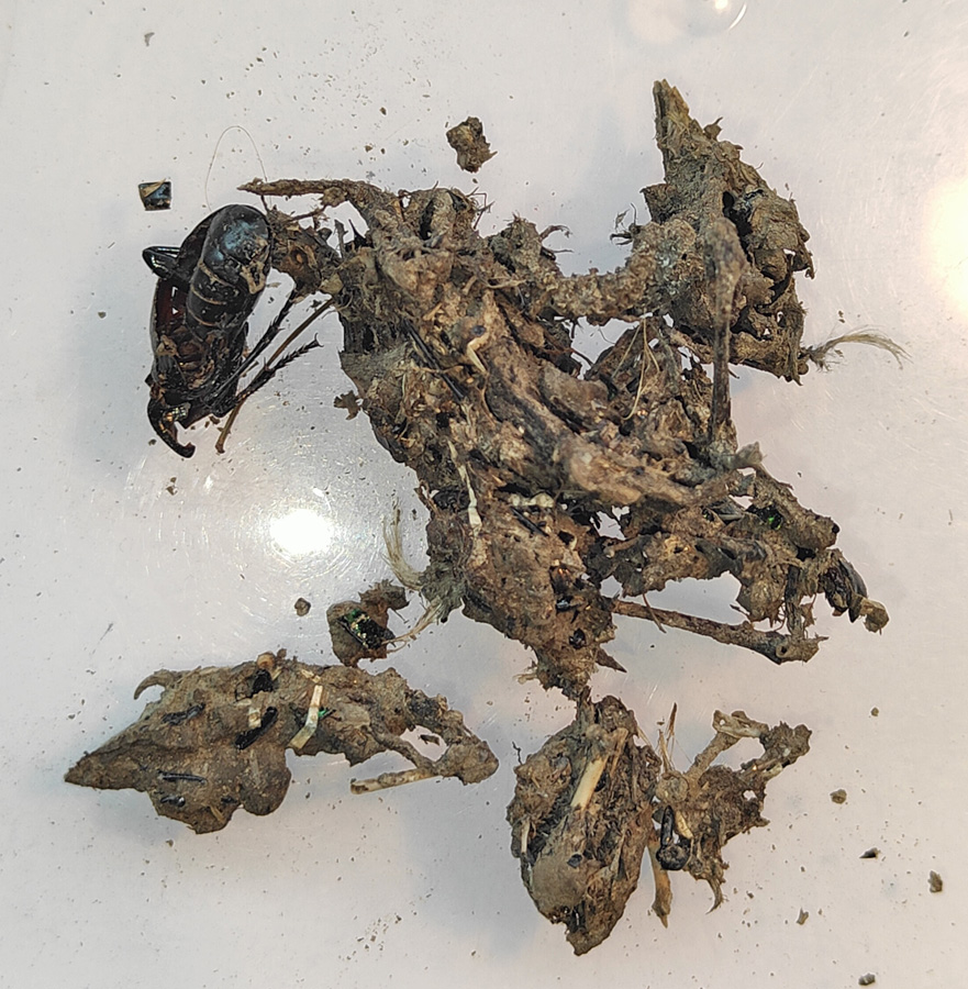 Large-sized bones of animals such as mice. Grey coloured mouse skin. Also, some sizeable Carabid beetles in the sample. Owls and Harriers have similar material in their pellets – seems to be a wonderful mixture of food for many birds.