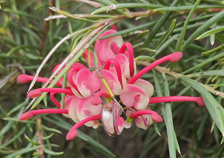 Grevillia is a species that hails from Australia. Some older TV Gardening Show watchers may remember Don Burk doing his hour-long shows every week – he loved Grevillia and so do I. In mid-winter, birds and pollinating winter insects will look for these flowers, filled with nectar.