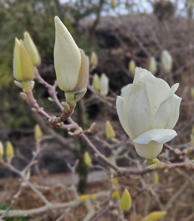 White Magnolia are coming out right now. No pollinating going on, just plenty of off-white colours that lighten up your boring garden background.