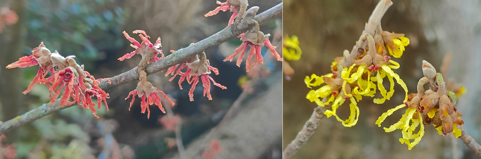 The red Witch Hazel is known as Hamamelis x intermedia Jelena. The colours sometimes float in a copper direction, with a smell that’s just divine.