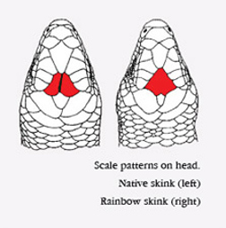 Identifying them from native species is not that easy: you’ve got to look at them up-close and focus on the top of their head; Right in the centre of the head – right on top and between the eyes – is a large diamond-shaped scale. That is the plague/rainbow skink.