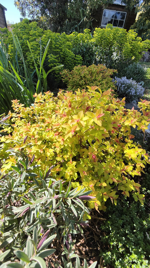 Hebe, Euphorbia, and bright yellow Spiraea japonica “Gold Flame”.
