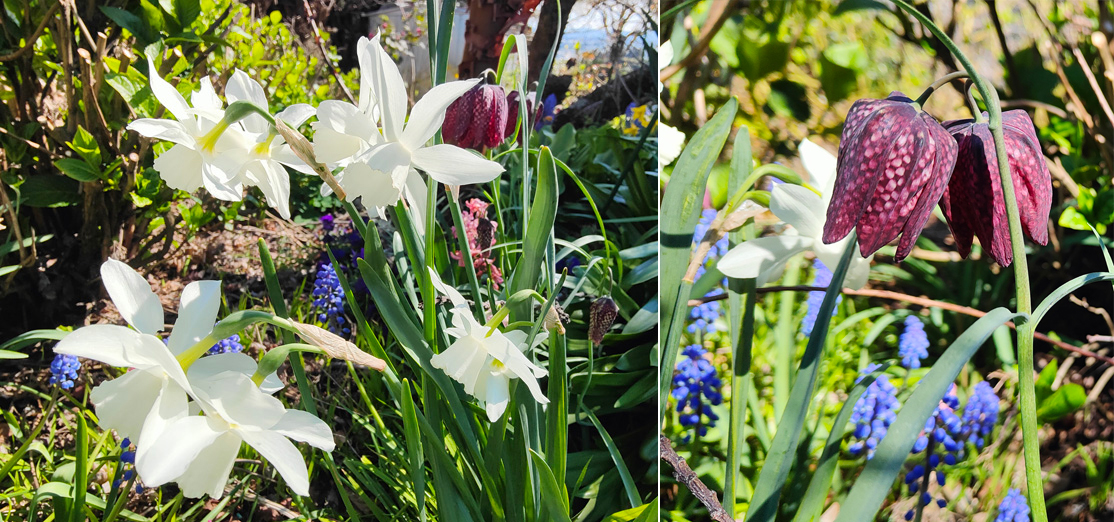 Thalia Narcissus with white accents (orchid narcissus) and Fritilaria contrasting with green and blue.