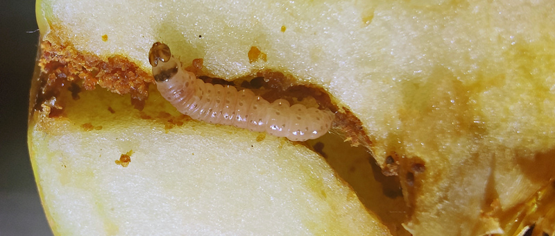And then there is our codling moth (which arrived all the way from Europe, many, many years ago). Moths lay eggs after flowering of the apple trees (and crab apples, and walnuts!) Out of those eggs hatch very hungry codling moth caterpillars that will tunnel into the developing apple fruits, spoiling them.