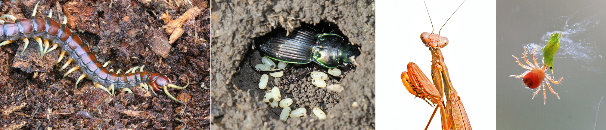 Left to right: Giant Centipede, Alexander Beetle, Praying Mantis, Predator Mite