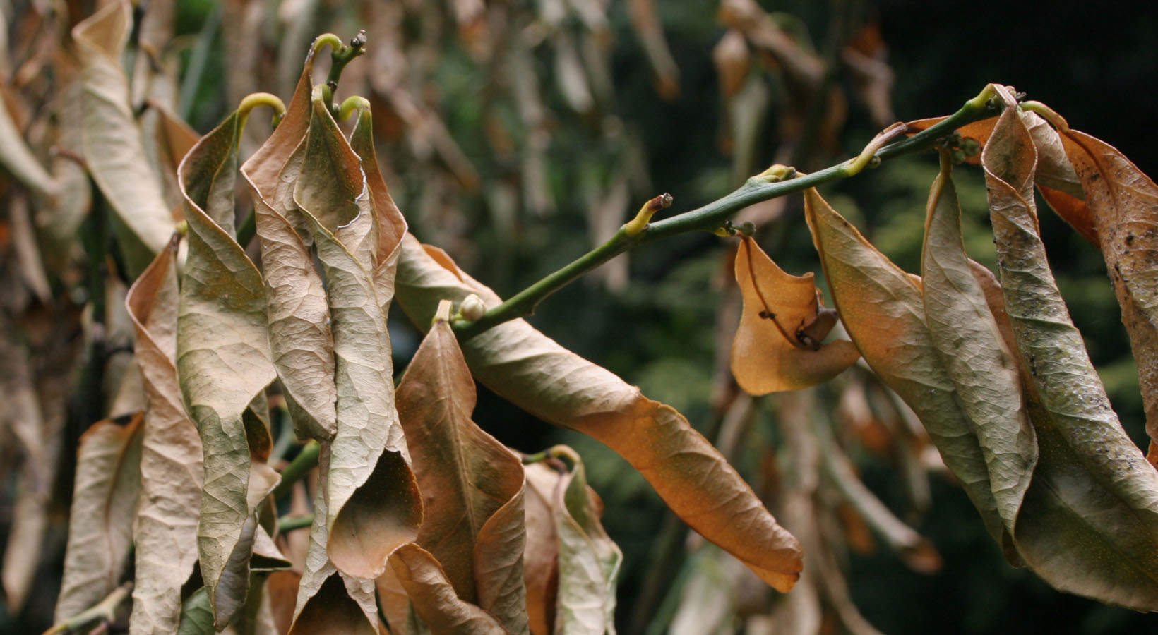 Drowning roots stuff the oxygen balance, causing severe stress, discoloration of leaves, blisters on stems and leaves, leaf-fall, and die-back of branches.