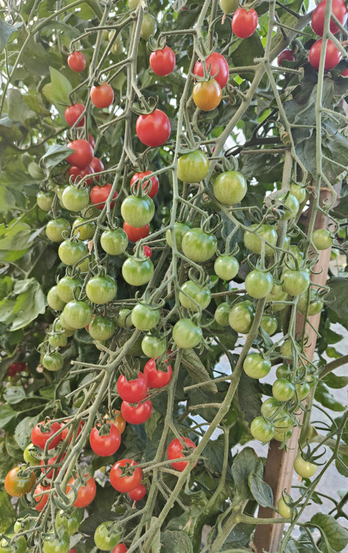 My biggest crop is F100 (sweet cherry tomatoes) that come in red and Brown-ish hues; The original F 100 is really long-lasting on the plant and keeps going the longest. It’s my standard variety that is best represented in the tunnel house. It’s also the basic tomato for roasted tomato sauce, creating the Bolognese for decent Italian meals