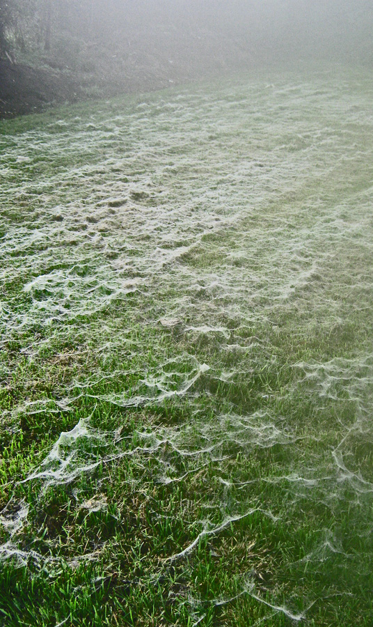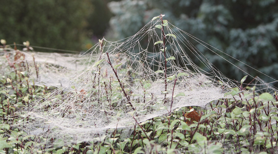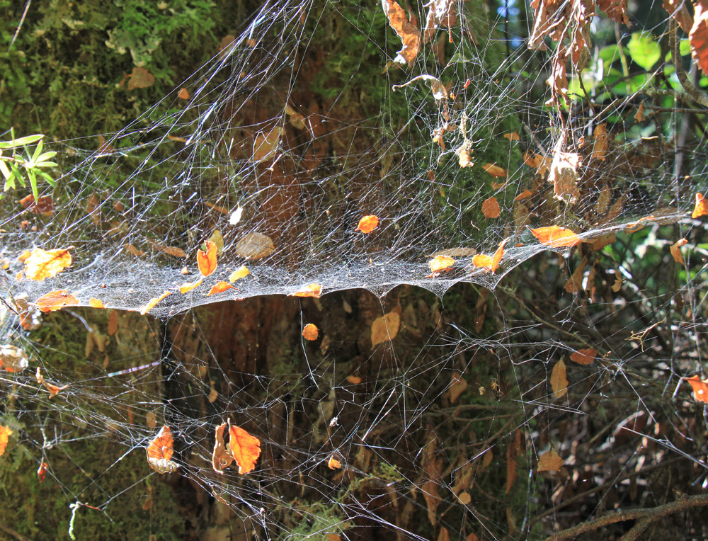 But winter finds that spectacularly weird phenomenon, known as “gossamers”. Small websites in conspicuous places, often made visible by fog or fine rainfall. The spiders usually hide under their web and grab overwintering insects (often very small critters), which sustains them and allows them to grow. If weather allows, they will “balloon” with a soft wind and disperse to new living quarters.