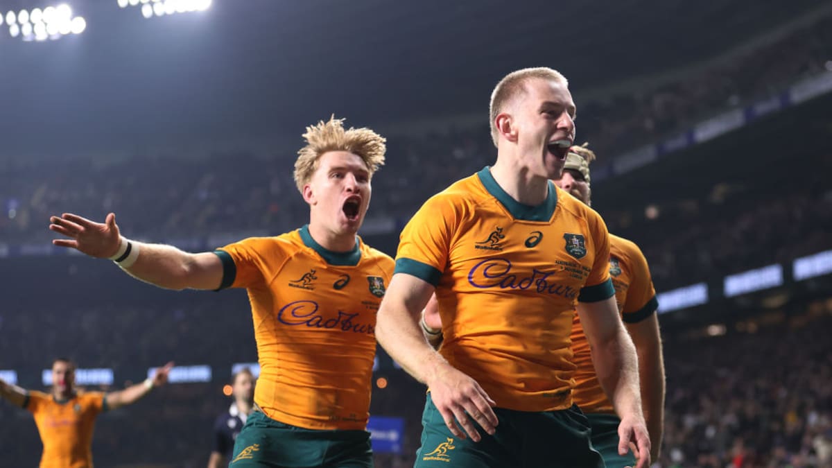 The Wallabies are celebrating a shock 42-37 win over England at Twickenham, nailing the first match of their Grand Slam attempt with a try four minutes after the scheduled finish.