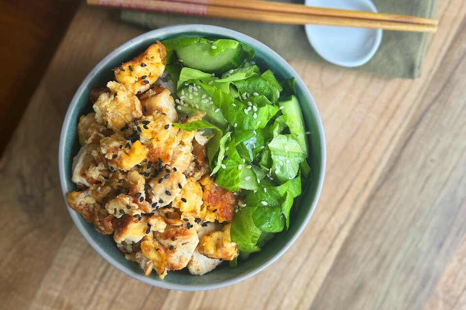 - Lay the salad and chicken on the rice and serve! Drizzle with the sauce and enjoy.