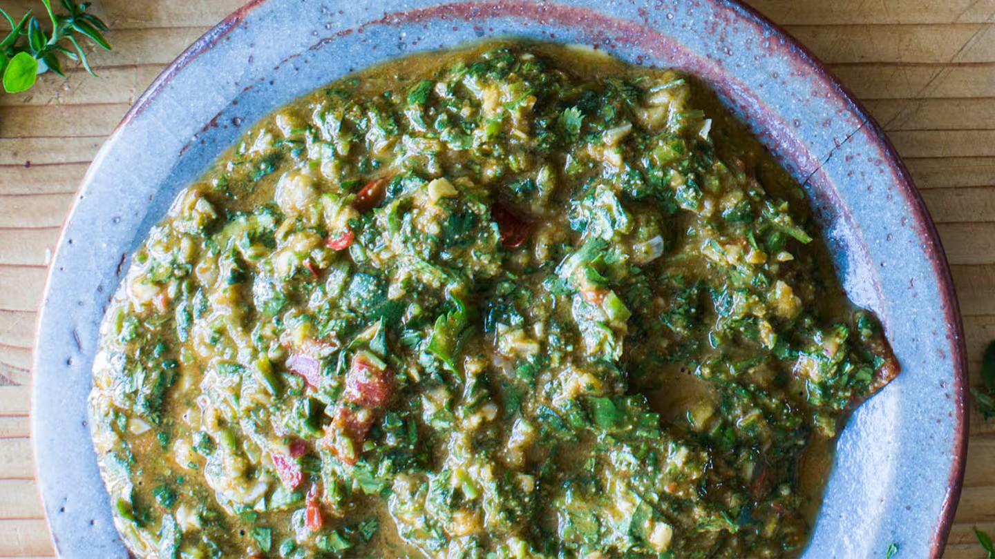 Take a mortar and pestle or blender and start by smashing up onions followed by the garlic, coriander and parsley.