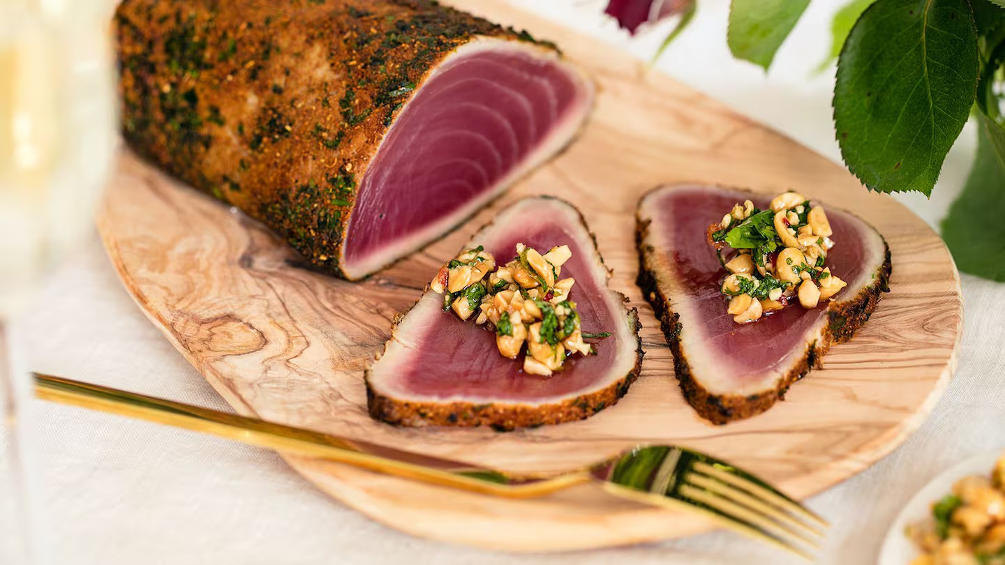 Place the tuna onto the flame and cook for approx 1 minute each side and remove to rest. The idea is to create as much colour on the tuna, whilst keeping the tuna as rare as possible.