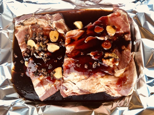 Add into a bowl along with the remaining ingredients and combine well. Pour over the top of the ribs and rub all over. Cover the ribs with greaseproof paper and then another layer of tin foil. Seal up as well as you can.