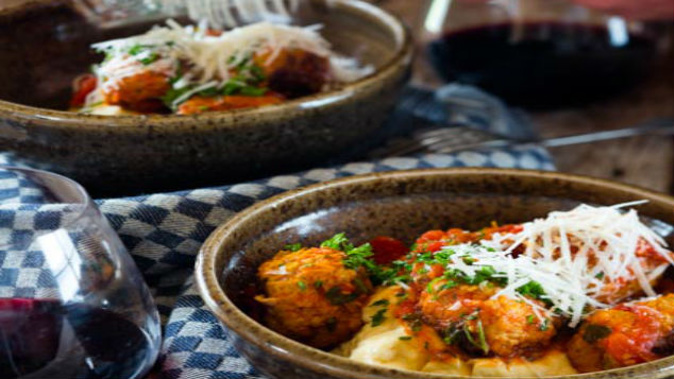 Preheat oven to 180*. Mix the first 8 ingredients in a large bowl until well combined. Form into balls. Heat oil in an oven-proof frying pan and fry meatballs until lightly browned. Pour the hot tomato sauce over meatballs. Bake in oven for 30 minutes.