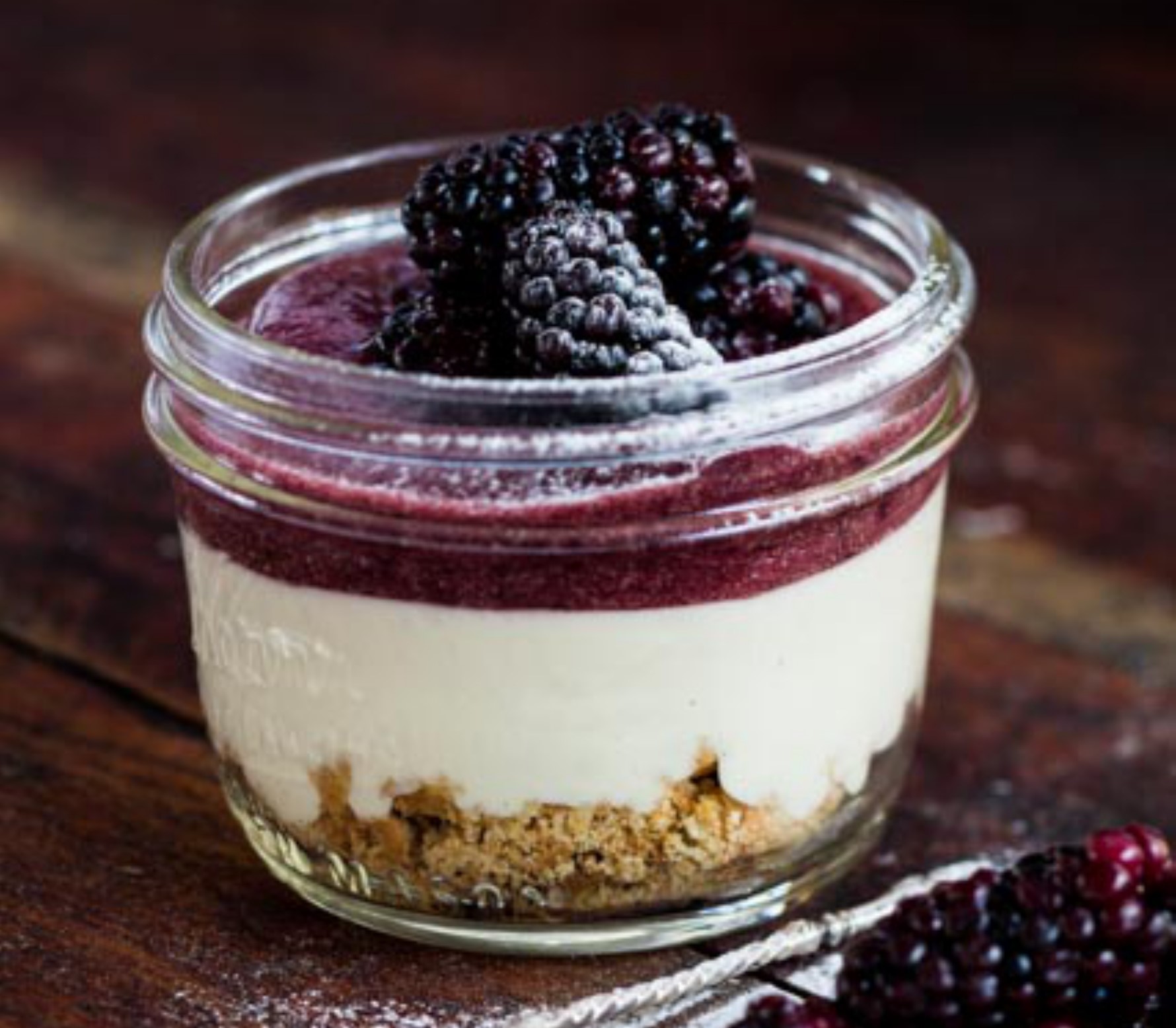Clean the processor bowl then put the tin of blackberries in with the brown sugar. Blitz until smooth, then pass through a sieve to remove the seeds. Combine with the rest of the gelatine mix. Spoon this over the top of the cheesecake and refrigerate for about an hour or until set. Top the cheesecakes with some fresh blackberries and dust with icing sugar to serve.