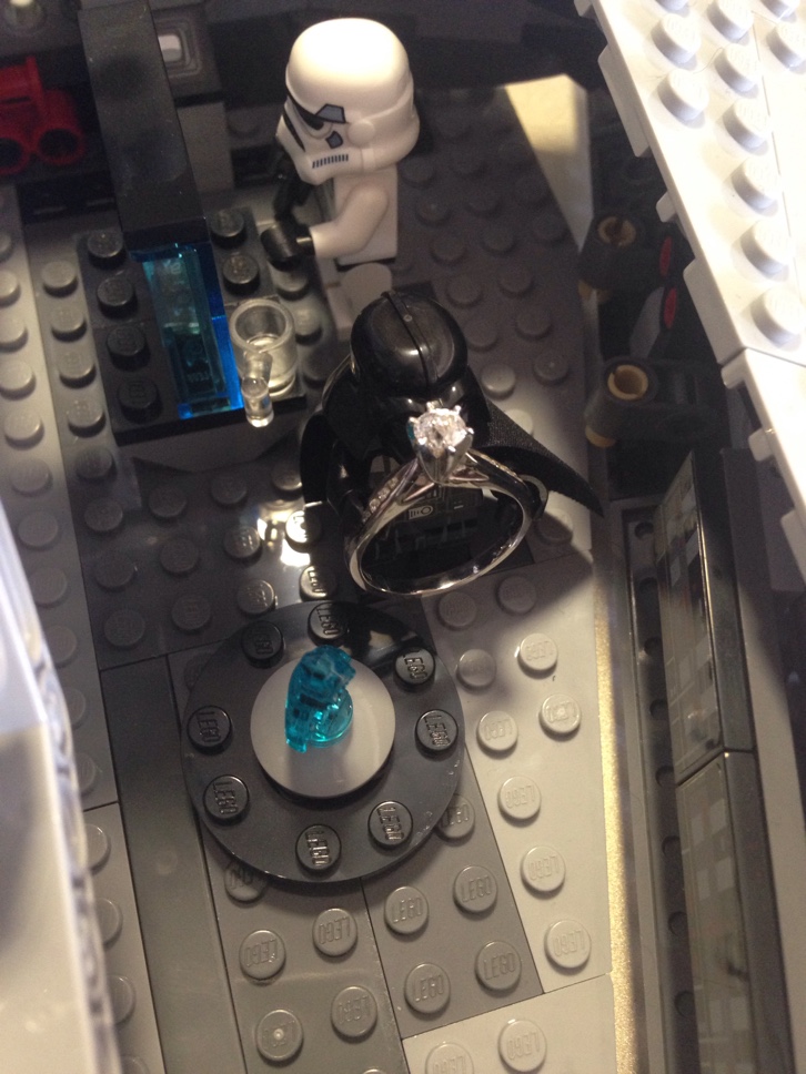 Stephen Dempsey proposed to his girlfriend Amanda by recreating the Imperial-II class Star Destroyer from Star Wars out of Lego and using it as a ring box. Naturally, Amanda, who is also a lover of the film franchise, said yes.Â