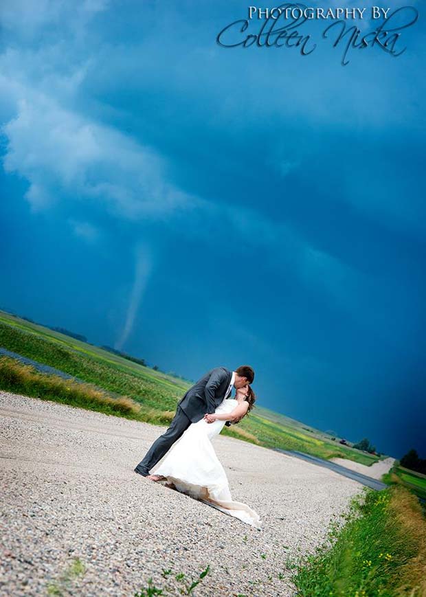 Instead of fretting about overcast skies and an unexpected tornado near their wedding venue, a couple in Canada and their photographer used the natural disaster as a stellar backdrop.