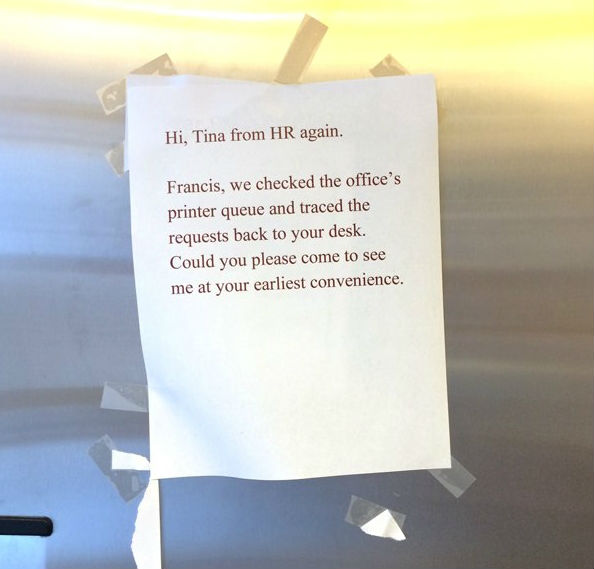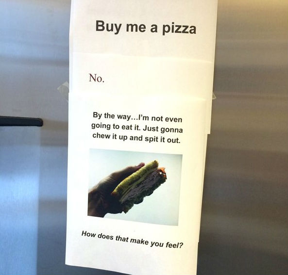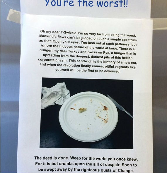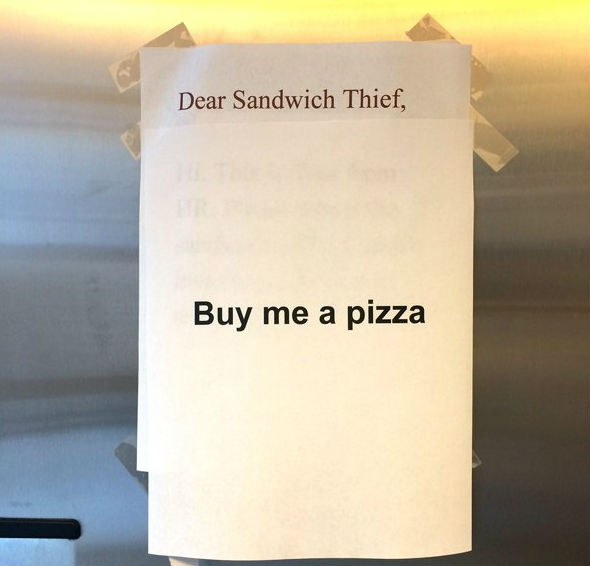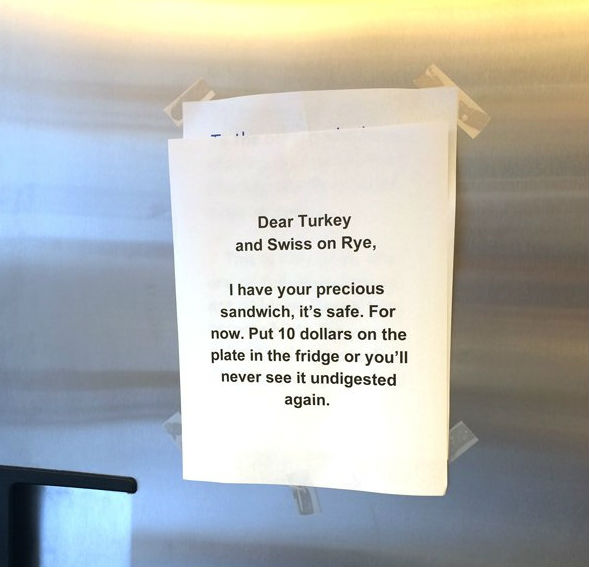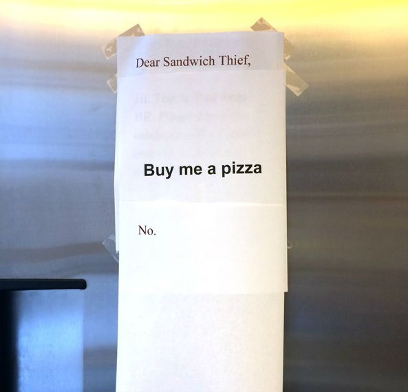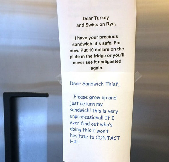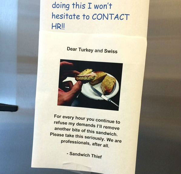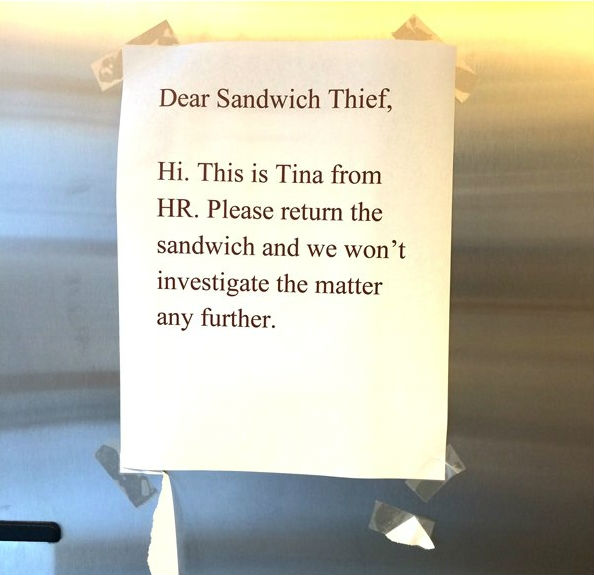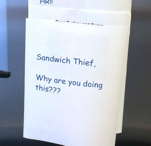 It's amazing how one's lunch can go missing at work. One employee decided to take action and find out who stole their sandwich, but probably didn't expect this paper trail from the thief... Photos: WeKnowMemes.com