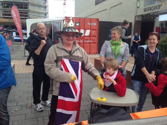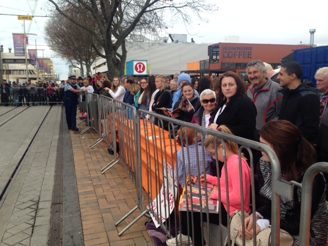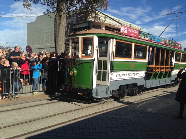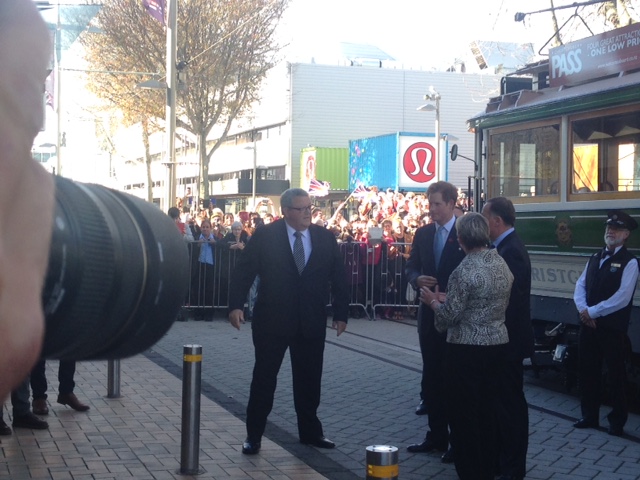 A crowd of 500 has turned out to line the tracks of the tram to come and see Prince Harry. He shook hands with the Prime Minister and earthquake recovery minister Gerry Brownlee before they all hopped on board (Photos: Charlotte Lewis-West)