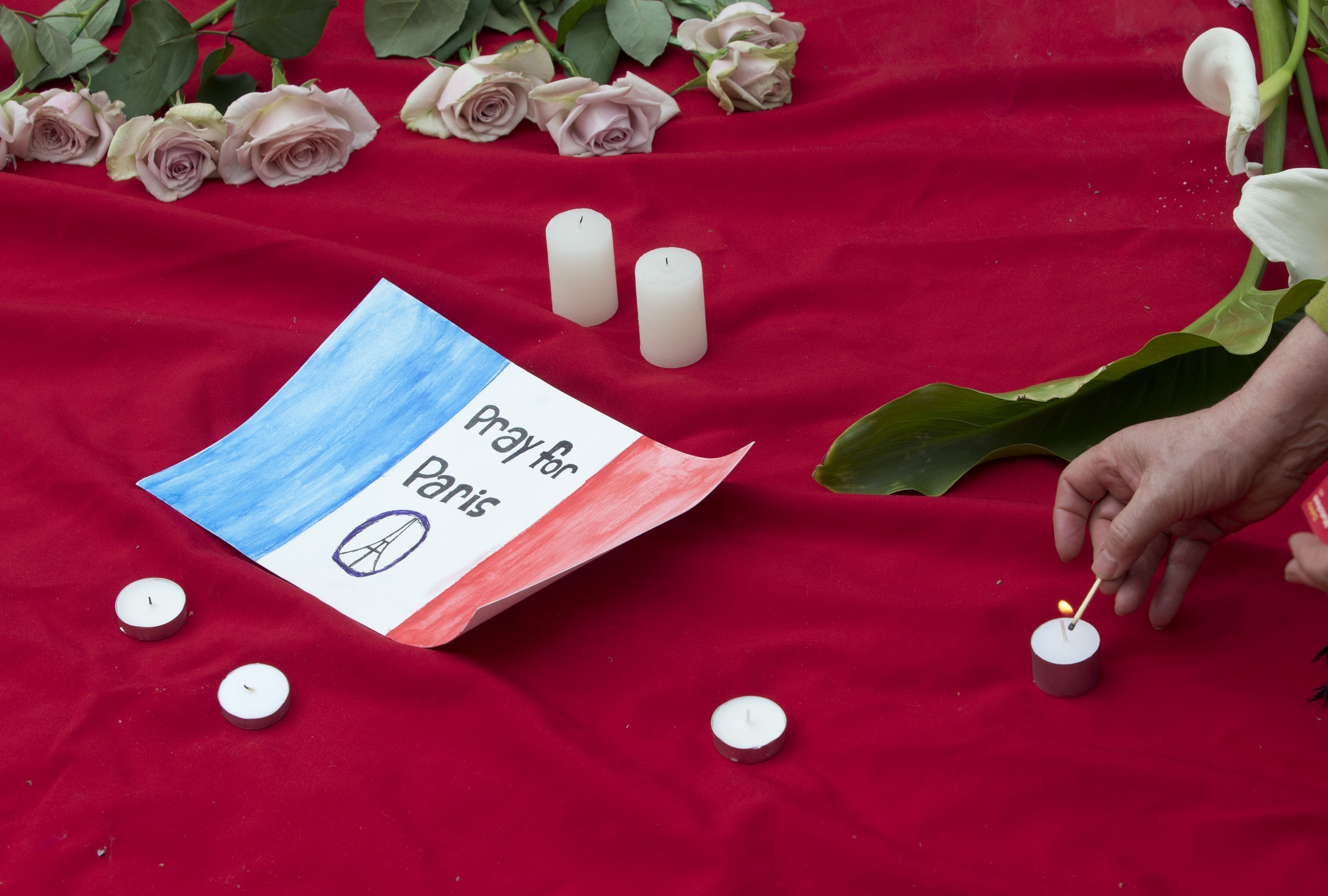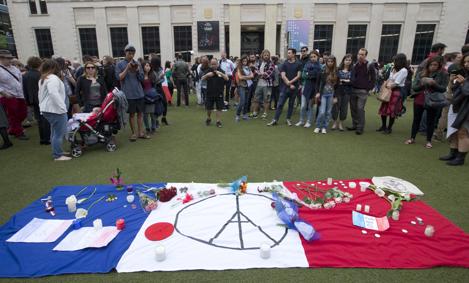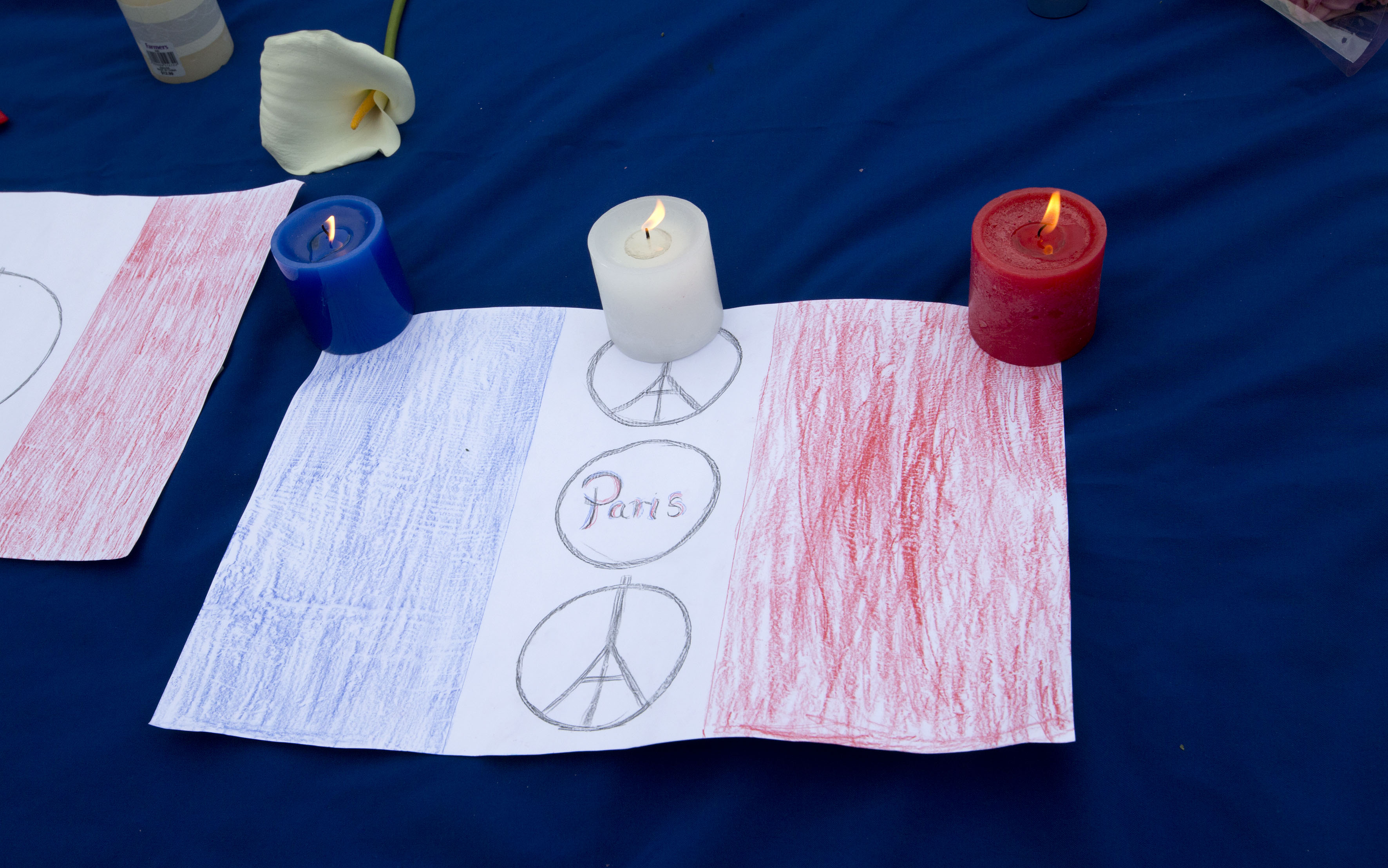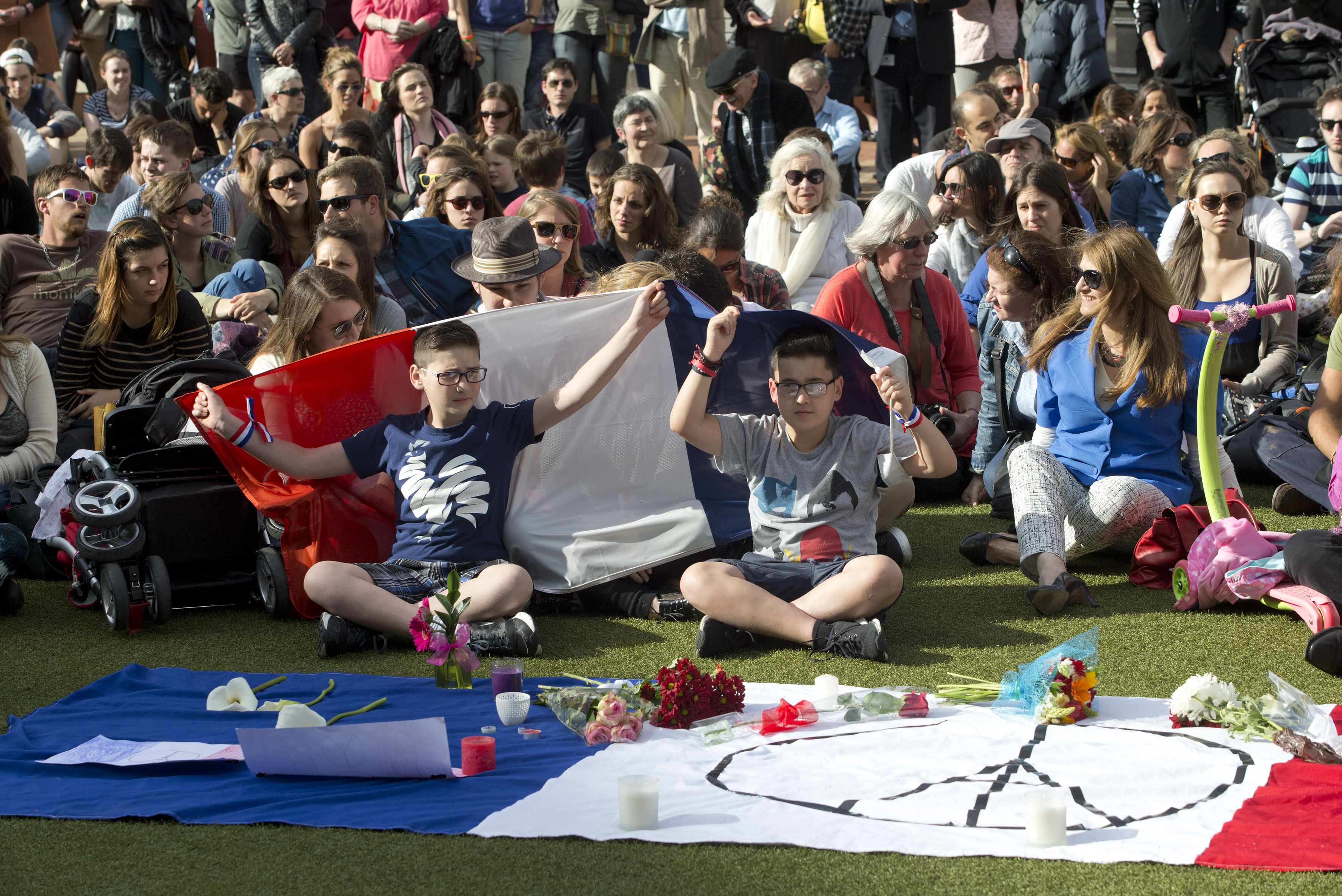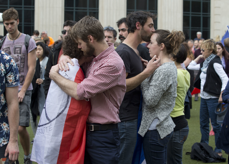 Hundreds of people have gathered at Wellington's Civic Square, where the French flag flies at half-mast today, to commemorate victims of Saturday's Paris terrorist attacks.