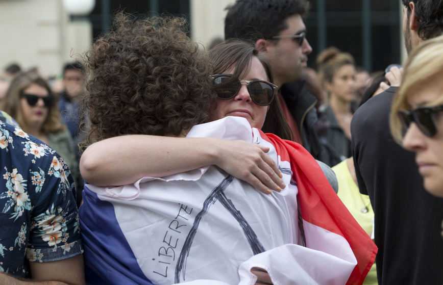 Many in the crowd are wearing French flags, or have brought the Tricolore along.
