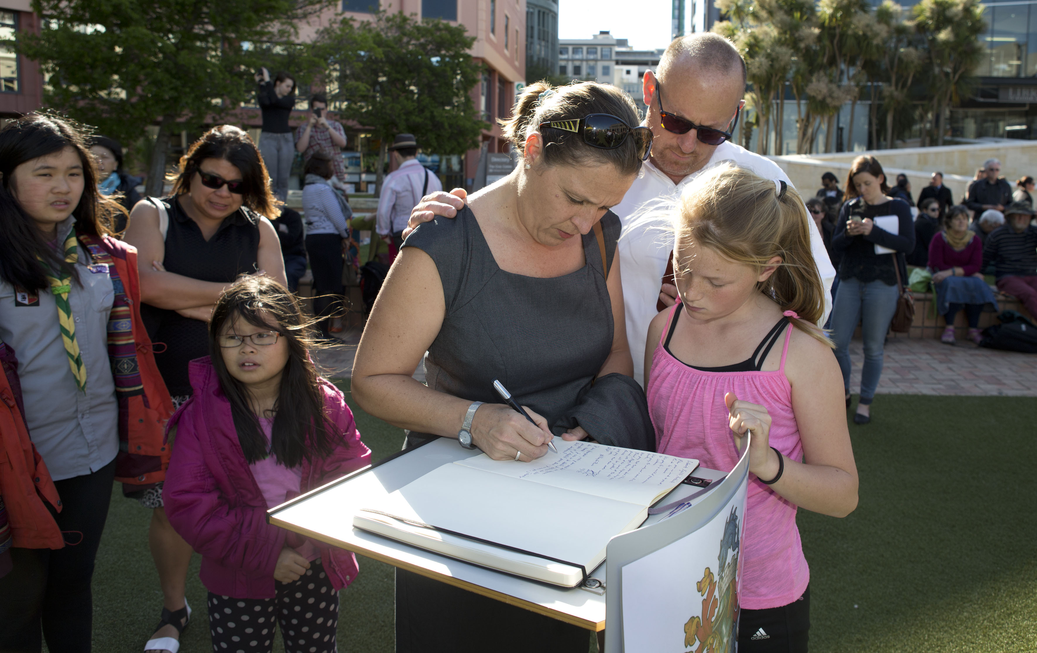 French Ambassador to New Zealand Florence Jean Blanc Risler read the names of some of the known victims, leading some in the crowd to cry.