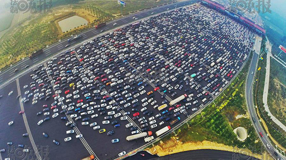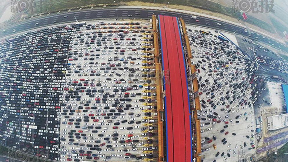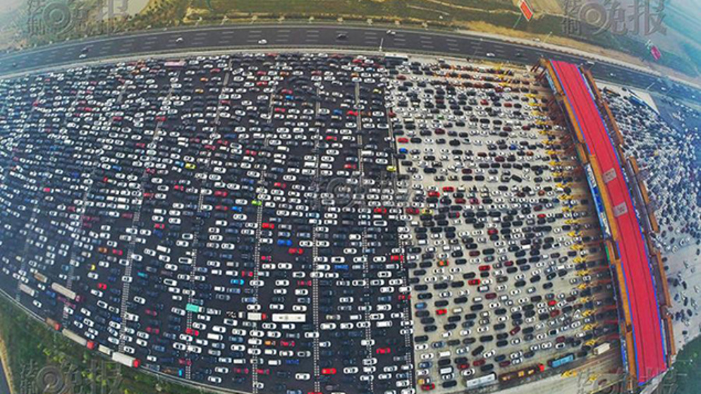 Do you think you had bad traffic heading to work today? You can think again. These aerial photos taken from the People's Daily China show Chinese motorists who were all trying to re-enter Beijing at the same time, causing major issues. This extreme surge in traffic was due to Chinese National Day celebrations known as 'Golden Week' which brings a boom in tourism, and in traffic.